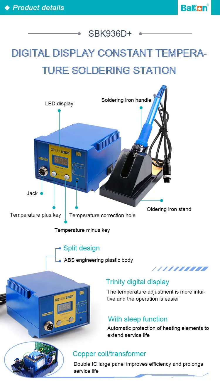 | Item | Bakon SBK936D+ lead free smd homemade ceramic heating element computer soldering station | ||||||