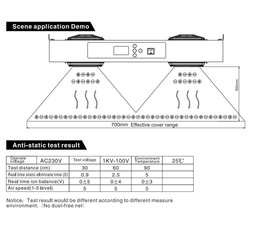 Show a typical example below:The aluminum plate’s square is 150mmx*150mm,its amount of charge is +1000V,electrostatic elimination(20pF) (Max wind volume setting of blower)