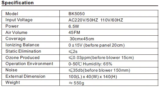BK5050 small ionizing air blower specification: